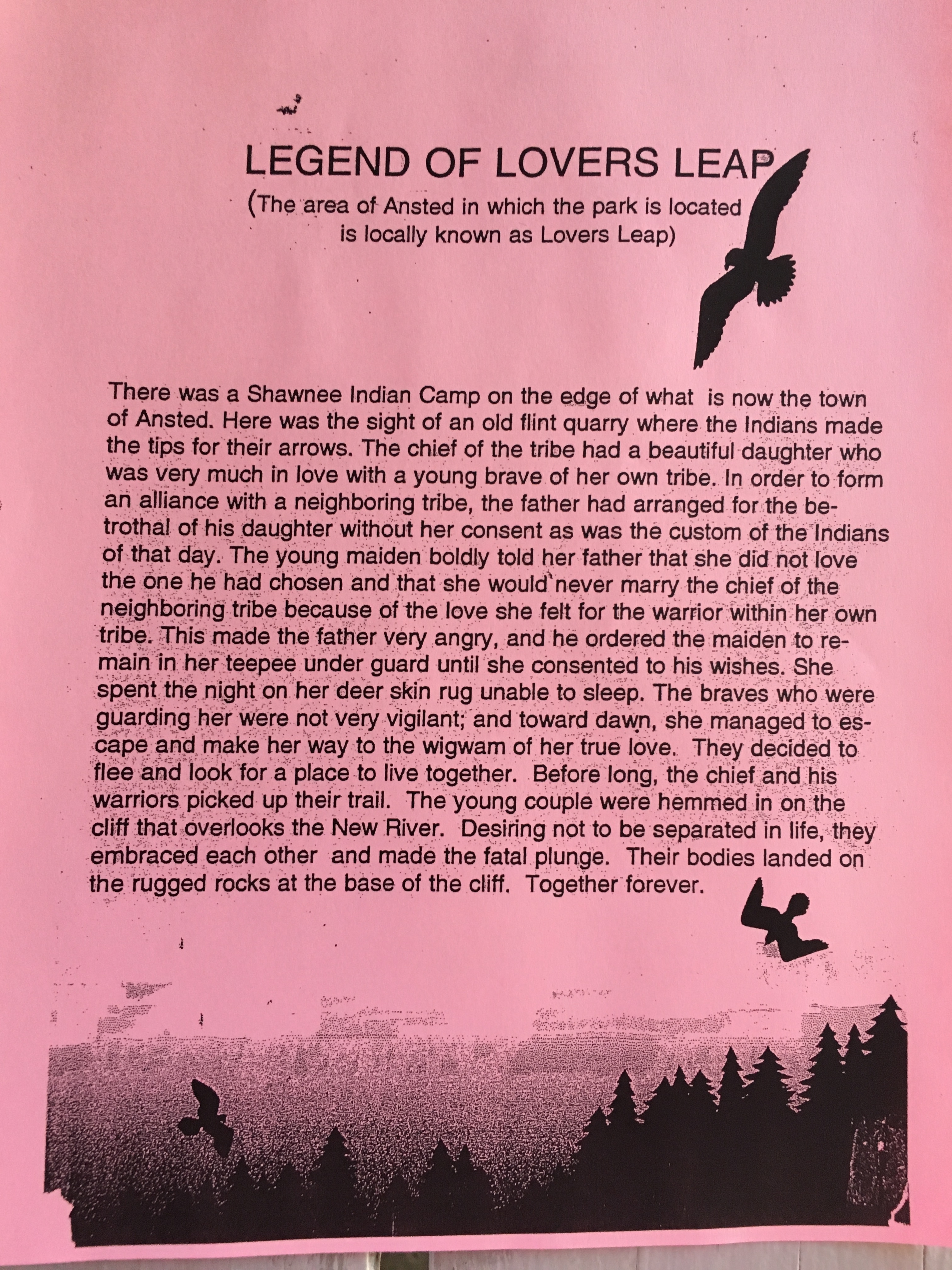 Before we left, we swung through the gift shop to look for squirrel merchandise we knew Pam would love dearly… The attendant was AMAZING. Then we journeyed a few miles up the road for the second Hawks Nest stop: Lovers Leap. I may have gotten married there once or something. We helped a group of kids take a picture and were then back in the truck on our way.