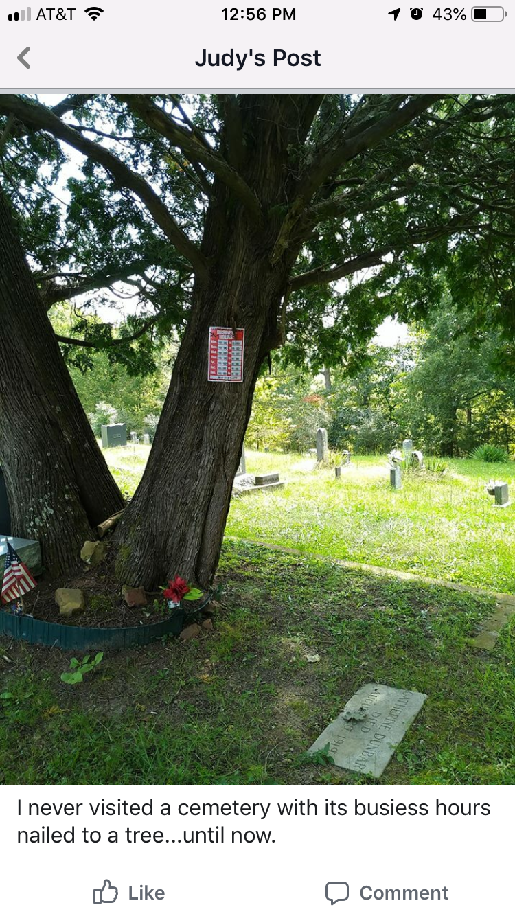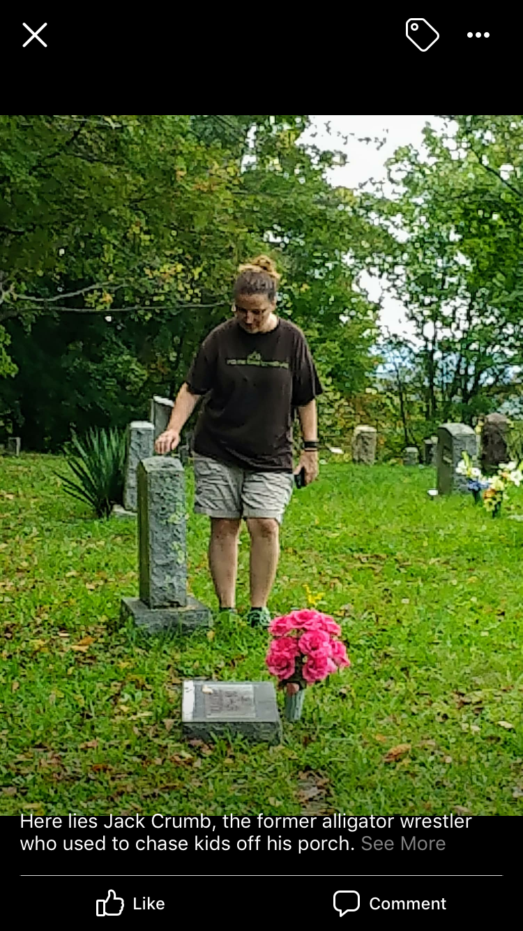 Judy and I share a love of ancestors, genealogy and not being afraid of cemeteries. On Saturday we would visit two different cemeteries where my roots are (literally) planted. (Fun genealogy trivia: the difference between a cemetery and a graveyard – a cemetery is privately owned by a business whereas a graveyard is a burial site adjacent to a church. So if it is noted in a genealogical record that someone is buried in a graveyard, you might want to check the church records of the adjacent church for baptismal or marriage records.) High Lawn Memorial is where my Parents are buried. Judy helped me locate a few other graves and we found a register of graves inside the office of the gravediggers (not an affectionate nickname, I generally despise the people who run this cemetery for numerous reasons I will not go into here). Later in the day we would wander about Hilltop Cemetery trying to find a great grandfather but instead finding the childhood memory Jack Crumb, the alligator wrestler who lived just below my parents’ house and who used to throw things from his porch at kids walking by his porch. Good seein’ ya Jack.