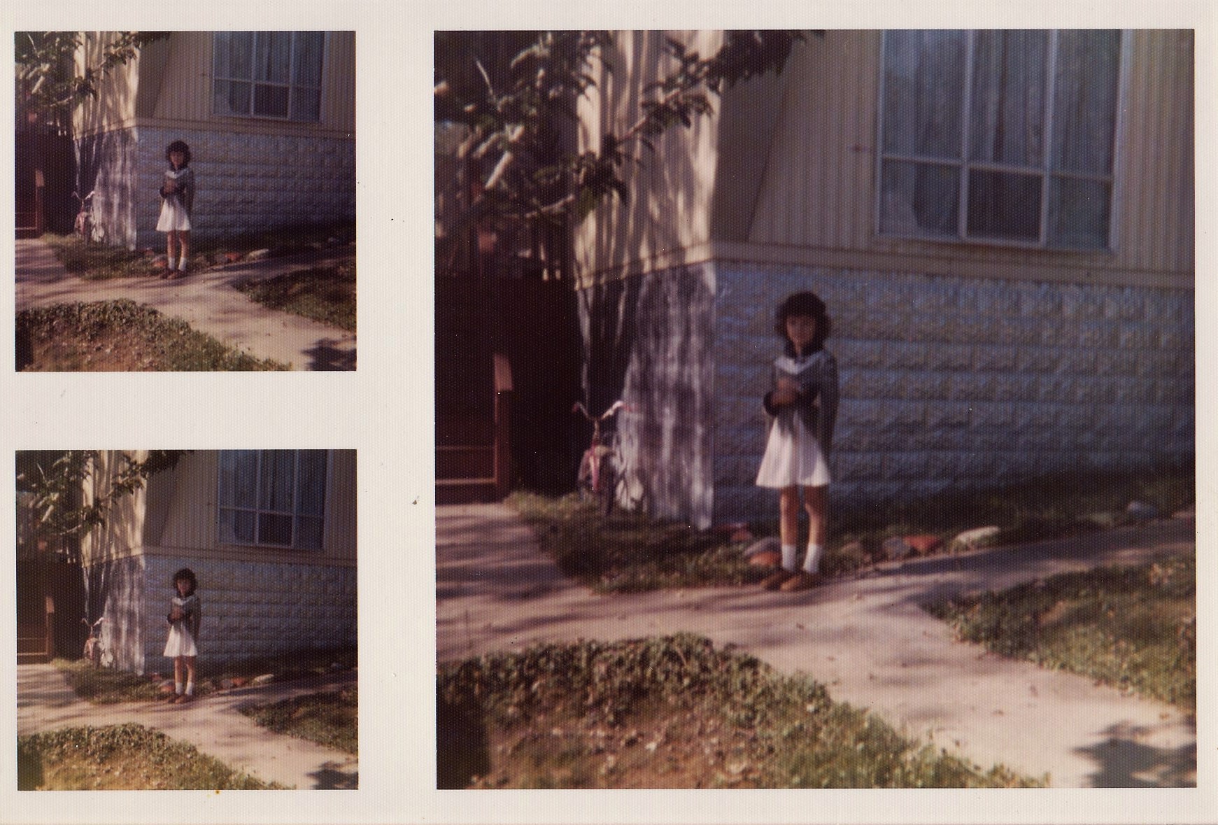 And this is a picture of me, standing next to the “old trailer”. The yellow one before the brown one. I am so little. Had to have been either picture day at school or Easter. Those were the only two times each year I wore a dress.