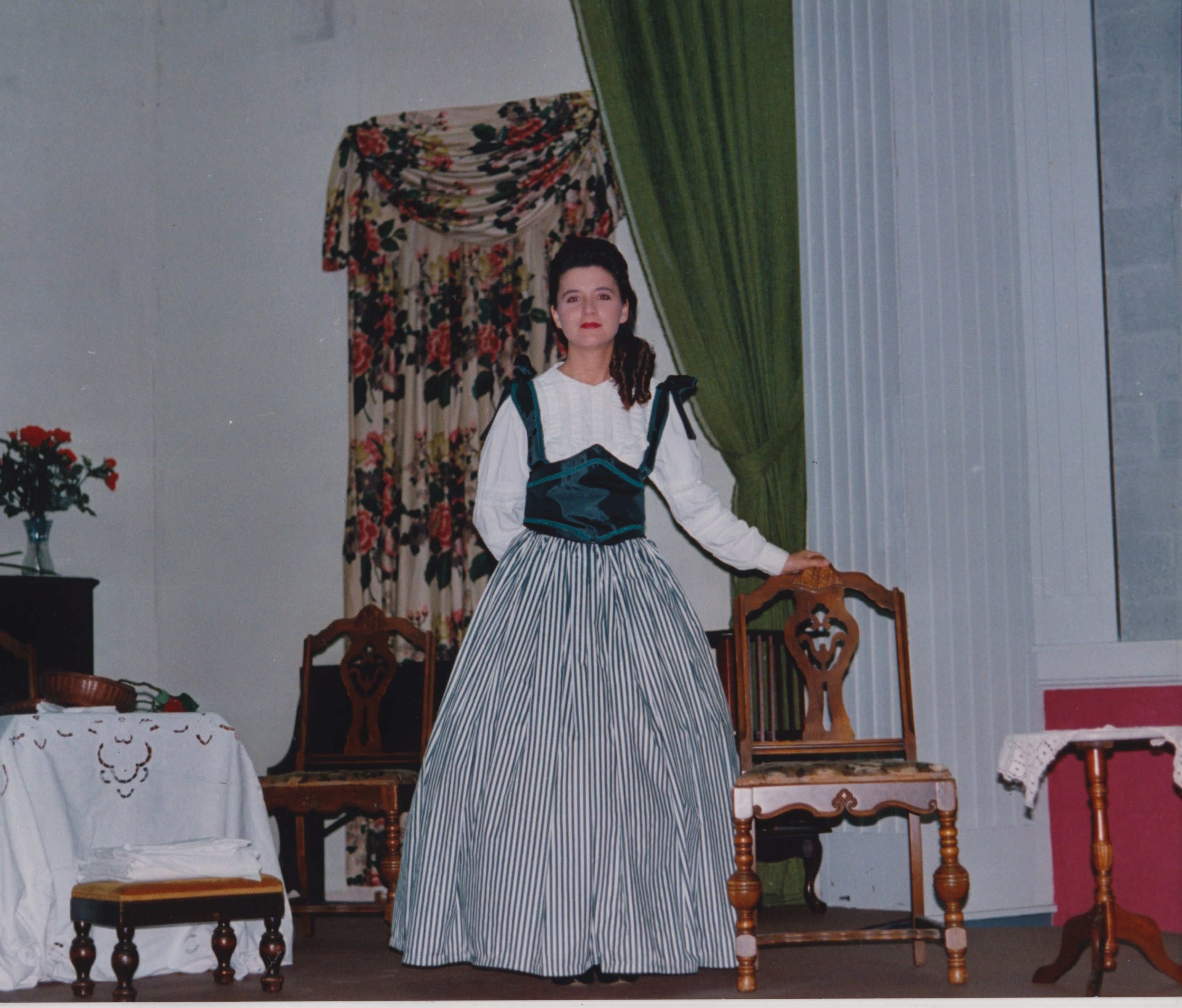 We started our adventure on Friday, October 5, 2018. Once she parked her car and all of the hugs were had, we ventured out to see a handful of things which were close at hand. First up was a walk about town in Fayetteville. I showed her the Historic Fayette Theater where I spent a copious number of nights/days rehearsing and putting on shows. Below is me, in costume for Women Must Weep. I played Catherine Carter, the outsider (or northern harlot, if you choose). Yes, that is my real hair.