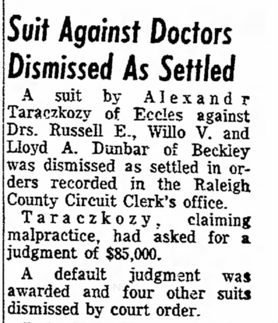 More recently I took it upon myself to find every article in print with the (correctly spelled) name: Taraczkozy. I found hundreds. I did not clip all of them but the vast majority I saved and put in the Ancestry tree under the person detailed in print. I wrapped that project up this week with a string of finds (once again) on Pawpaw. It appears that he took a local doctor to court and prior to trial worked out a deal with him to dismiss the case: