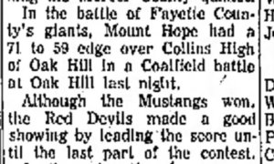 Inside the program is my Dad’s chicken scratch where he tallied the score as the game went on. According to The Raleigh Register (Beckley, WV published 3 Feb 1960, page 8), Mount Hope beat Oak Hill with a score of 71 to 59 (article clipping below).