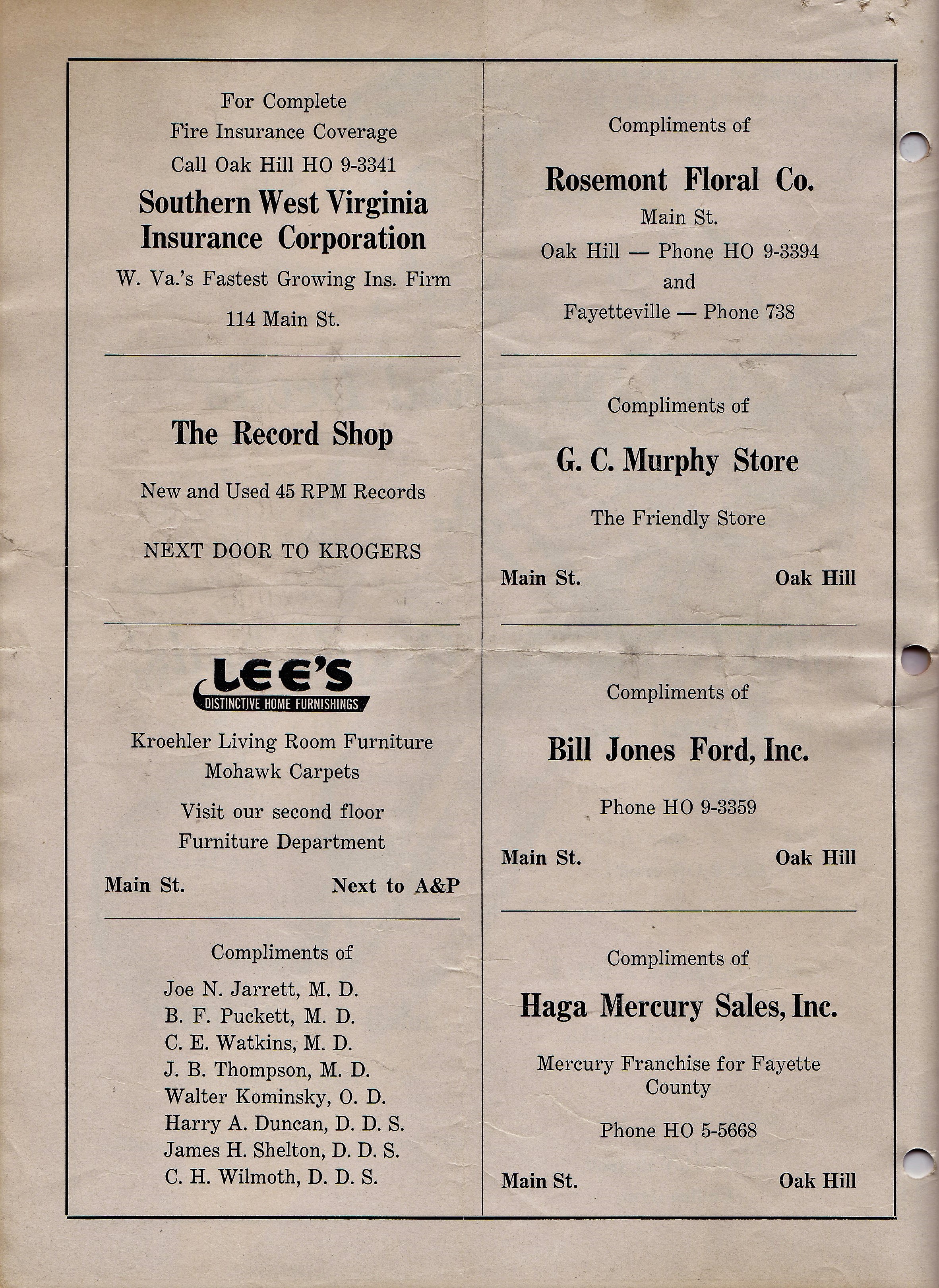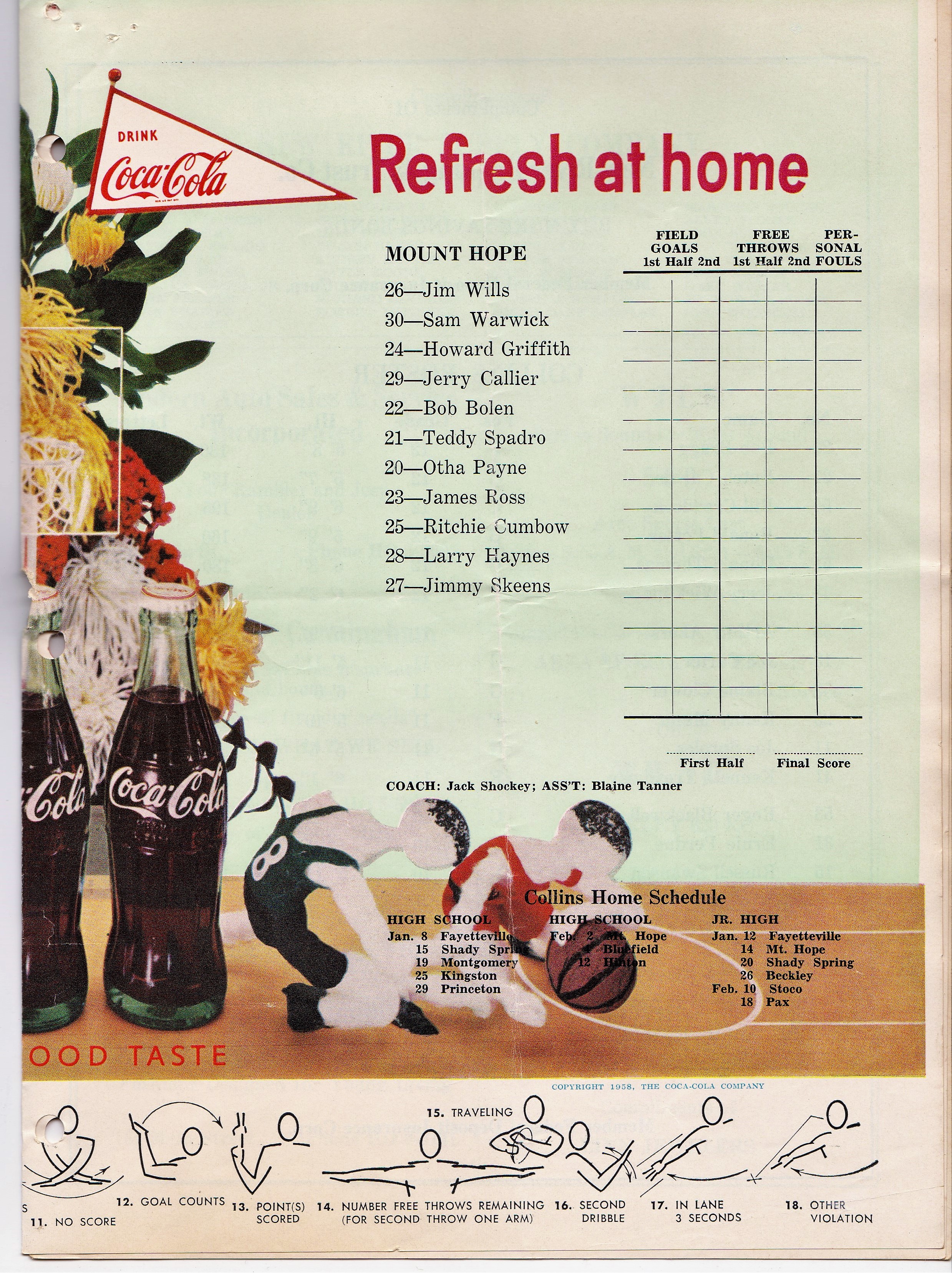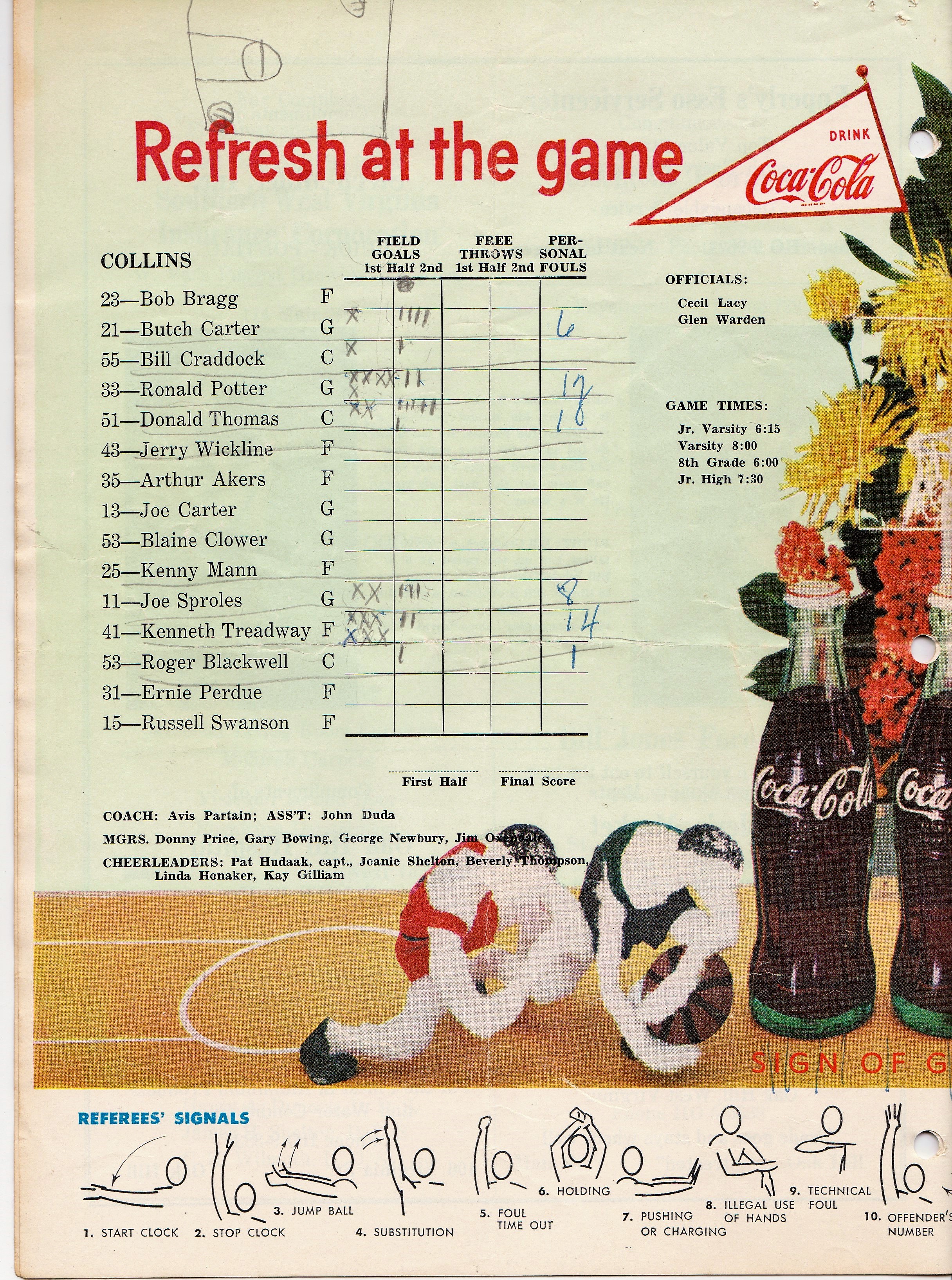 I realized that the binder in question was Dad’s as it is filled with sports programs from VA Tech, WVU and Oak Hill (WV) High School. These must have been his more prized programs, maybe by date or sentimental memory. The two programs covered in this particular blog are for the 1960 basketball season of the Collins “Red Devils”. Both programs are for Collins home games.