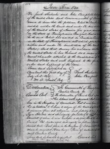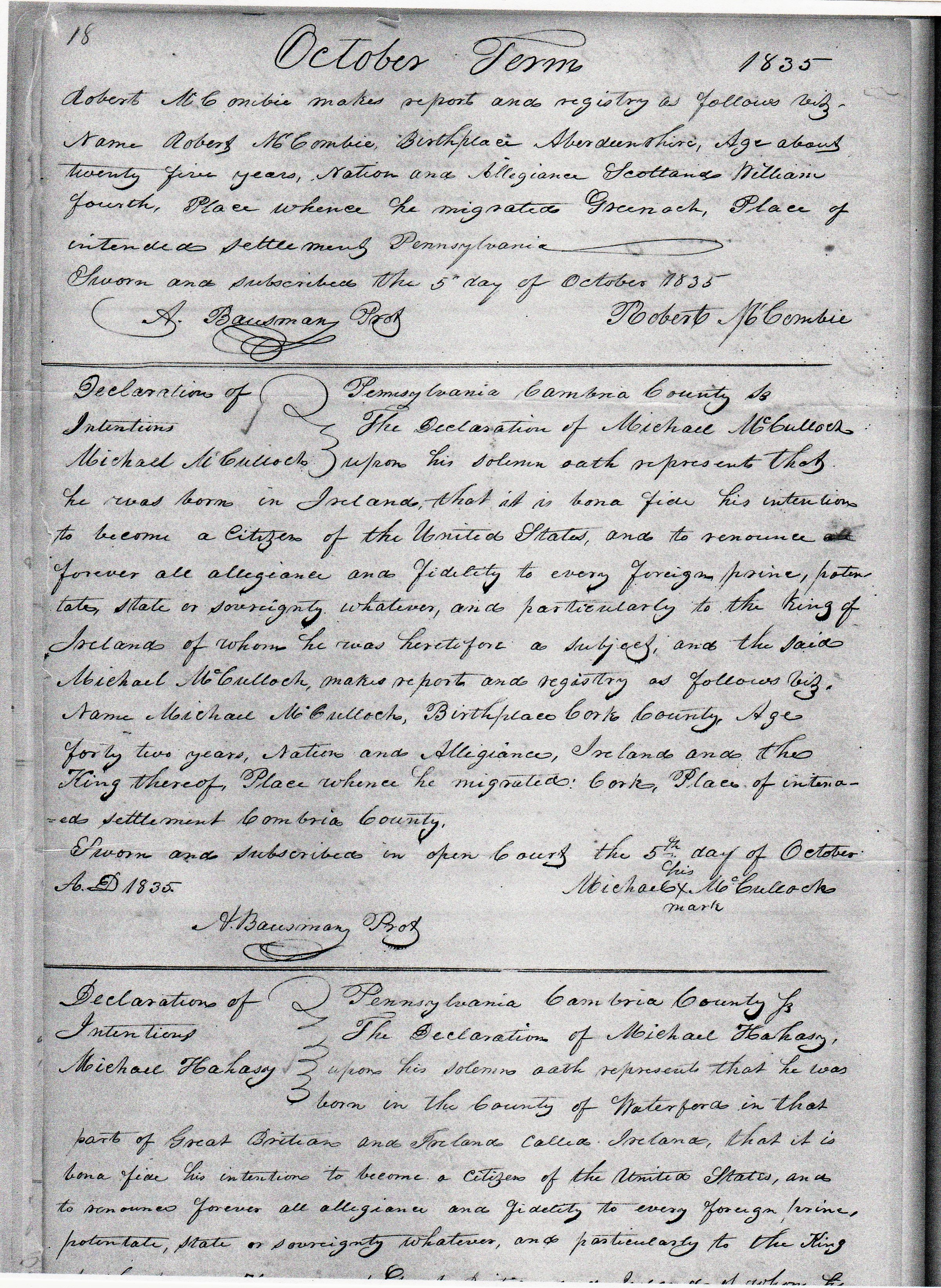 Using the year 1835 as his immigration year, and knowing he would be in his mid twenties, I started researching Cambria County PA sites in hopes of finding a solid lead. And that, I did. A domino effect of research led me to the Prothonotary Office of the Cambria County seat. As I am planning a research visit to the area, I thought I would inquire as to whether I would be able to stop in and fill out paperwork to request the ability to research any microfilm or old books they might have. The woman on the other end (who I wish I had asked the name of for thank you note purposes) simply asked three questions: 1-Name and spelling of your family member; 2-Date range you are looking through and; 3-What is your name and mailing address. Then abruptly she said: “I will look and if I find something I will drop it in the mail to you. Thank you, have a nice day.” And click. I was torn between trying to figure out if she was busy or rude. Ha! She must’ve been just busy because only a few days later an envelope appeared in the mail with the most wonderful breakthrough – the Naturalization Records of Robert McCombie!!