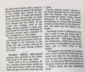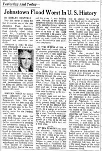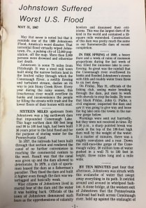 I found one clipping on the Johnstown PA Flood. As I am just returning from Johnstown and having visited the site, I thought that it would be an interesting post. I hope to write more about Johnstown and the National Parks locations (of Western PA) in upcoming blogs. For now, I hope you enjoy Mr. Donnelly’s article.