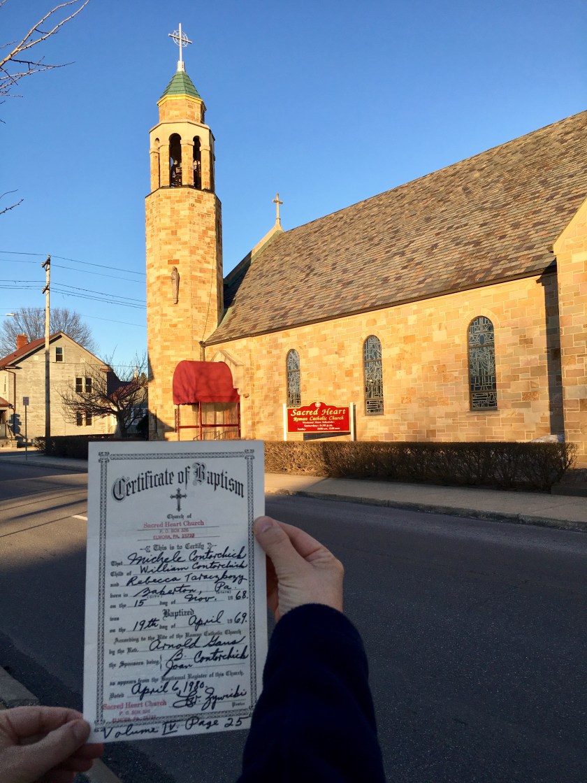 There was one church I hoped to find for more reasons than to walk the graveyard associated with it.  Fifty years ago this month I was baptized at Sacred Heart Church.  When I received Communion in sixth grade (I was a late bloomer but that’s a blog for another day), my Ma reached out to the church to obtain a certificate of baptism.  Looking at the certificate now – I shake my head at the various inaccuracies.  My name is spelled wrong.  My place of birth is incorrect.  Those things are so frustrating because I know the difficulties genealogy researchers face when trying to find the “passage to America” documentation for relatives with misspelled names.  But, I digress.  The certificate clearly notes the church: Sacred Heart Church, PO Box 326, Elmora, PA 15737.