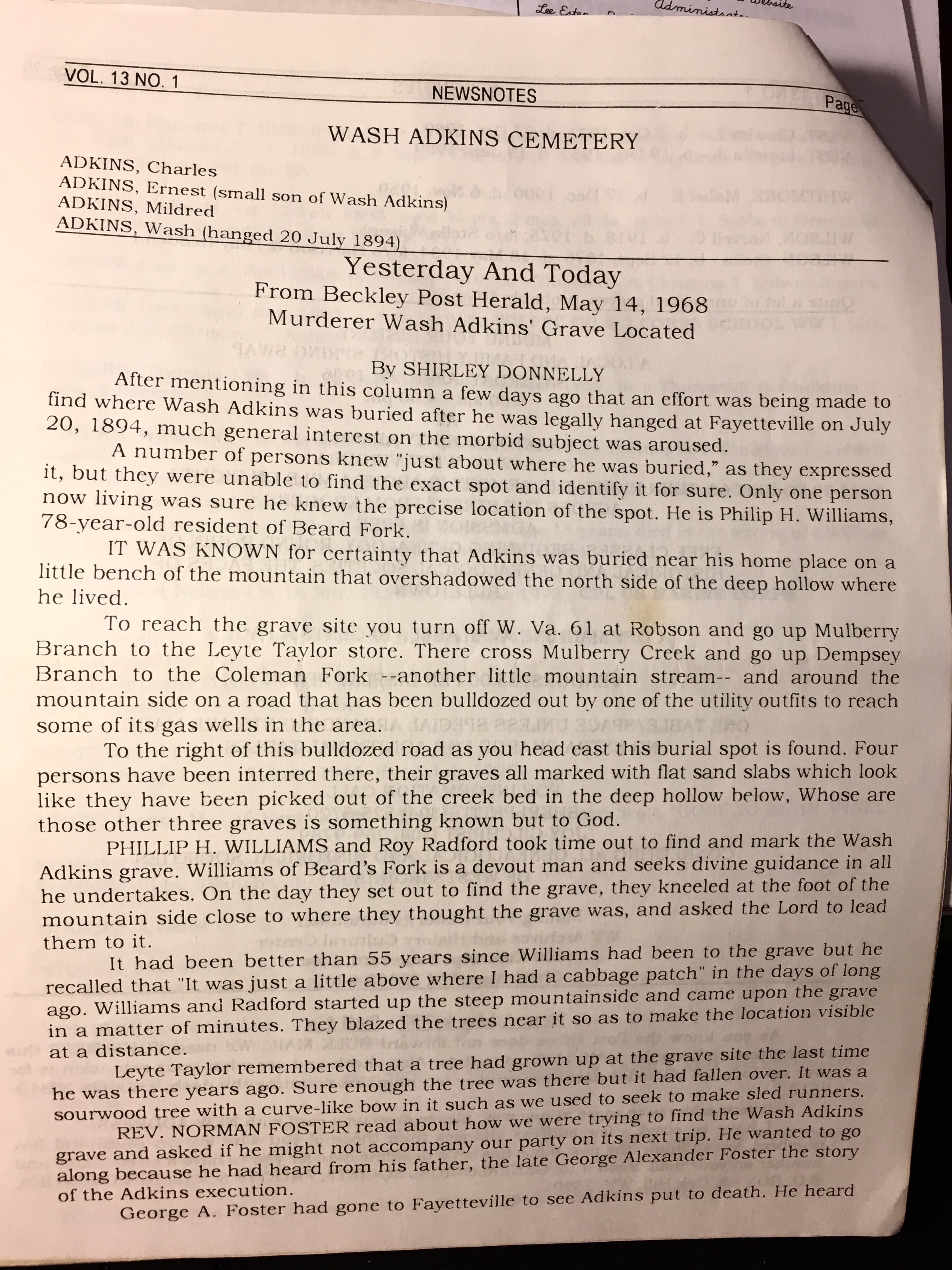 Great article. I grew up hearing about the Radford murder, the hanging of Wash Adkins and the search for his grave. The Layte Taylor mentioned in the Donnelly article was my maternal grandfather. Isaac Radford was related to “Pa Taylor” as we called him. An uncle, I think?