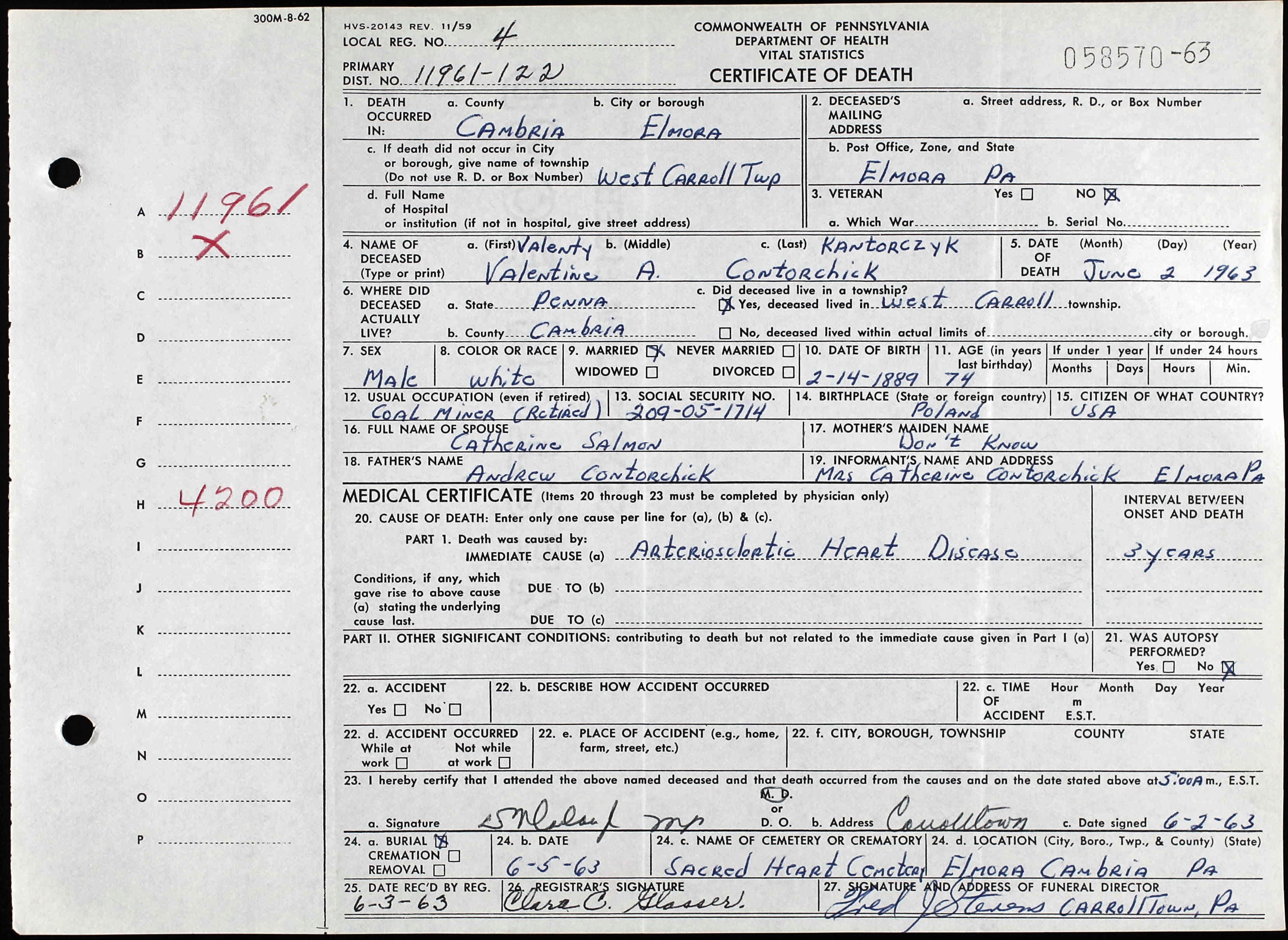 He enjoyed 20 years of citizenship until he passed away at 6AM on Sunday morning, June 2, 1963 in Carolltown, Cambria, PA. He died of Arterioscloratic Heart Disease at the age of 74 (he had suffered from heart disease for three years). He was a retired Coal Miner. His wife completed the paperwork necessary for this death certificate: