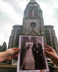 I found a marriage photo on Ancestry (someone who is managing the DNA of my aunt and cousins?). I printed it out and used that photo in the foreground and their wedding church in the background for this: