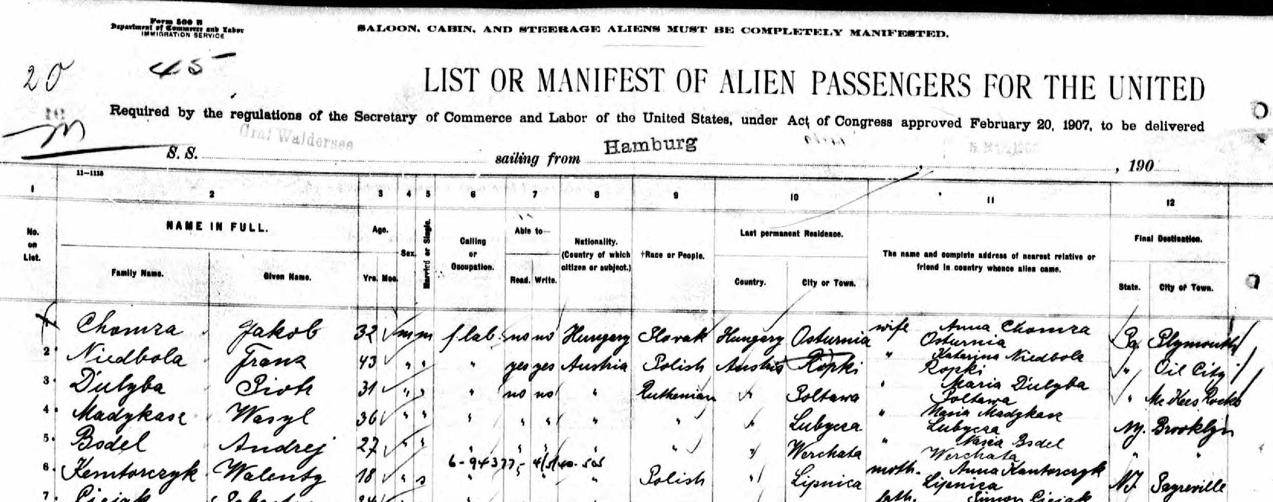 Walenty Kemtorczyk arrived in New York City on 19 Mar 1909, It took thirteen days at sea to complete his voyage. His birth year is noted as abt 1891 (same as the departure manifest). His birth location states Lipnica, Austria. His nationality is Polish.