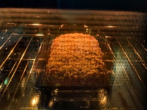 When blended well, put into baking dish and square it out. Try to get it to no more than two inches high (I was a little thicker than that and it took me longer than expected to thoroughly cook through). Pour half cup of water around the loaf. Apply cornflakes to top and sides.
