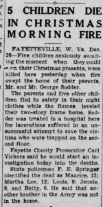 Fayetteville, WVA, Dec 26 – Five children anxiously awaiting the moment when they could open their Christmas presents, were killed here yesterday when fire swept the home of their parents Mr. and Mrs George Sodder.