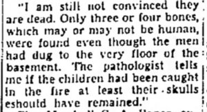 “A COMPLETE investigation of the burned premises failed to produce evidence of flesh or human bones. It is inconceivable to the intelligent mind that these children burned in that fire. Only a few who are interested in not having the crime solved persist in saying the children died in the fire. We would welcome, at any time, an opportunity to have an open discussion. However, they seem to prefer to ignore the issue. If by any chance, some of the ex-officials hurriedly come to the erroneous conclusion that the children died in the fire, and sincerely believe in the protection of helpless children, we would appreciate it if they would re-examine their consciences and lend a helping hand where it is badly needed. Respectable citizens who believe in the administration of justice and equality for all and the protection of innocent minors, have you any suggestions as to what we can do about it?”