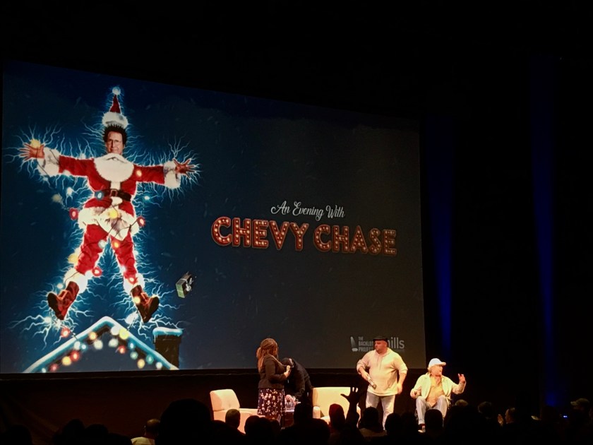The evening started nicely for us with dinner at a local pub. We easily found parking close to the venue (another story entirely). Our seats were great with good legroom. The movie was a blast to watch. With a sold out theater of this size, the laughter was contagious. There was a great laugher about three rows behind us. I loved listening to their barrel laugh during the funnier scenes. The audience was primed and in good spirits. They cheered and clapped at various parts and were eager when the movie concluded to see and hear Chevy Chase.