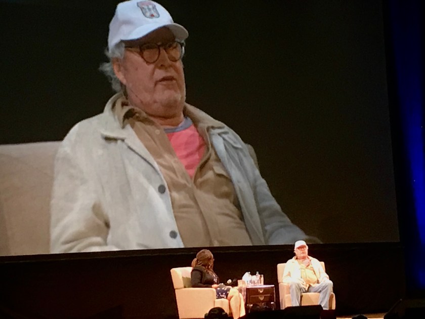 They wheeled Chase out in a wheelchair, slumped over and mouth hanging ajar. It was a sight gag and he got out of the chair, greeted the interviewer and made his way to his own chair on stage. Then came the almost hour long rambling of someone who was either in the throes of dementia, high, drunk, or ill. It was painful to watch. People got up and left. The interviewer would ask a question and he would start a rambling non-answer bit that was sometimes on subject, sometimes not. After a few minutes of “all over the place”, he would look at her and either say: “I don’t understand the question”, “What was the question”, “That’s all I know about that” or “That’s what I do”. Every time it would elicit laughter (sometimes sad laughter if you know what I mean) from some of the audience. It was annoying AF for me.