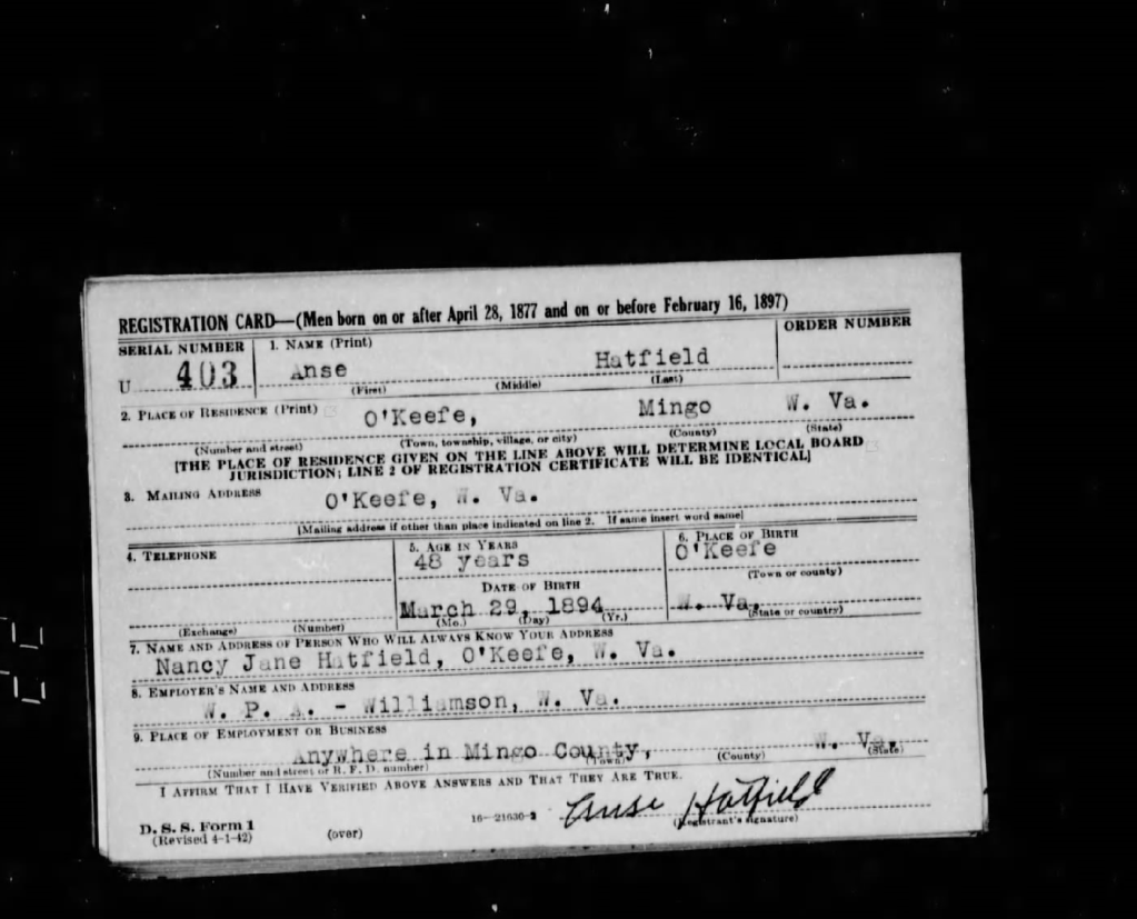The Logan Wildcats were suspected in the 1865 murder of Kentuckian Harmon McCoy, a Union army veteran and brother of McCoy patriarch Randolph McCoy. Hatfield’s uncle, Jim Vance, was a more likely culprit in this than Hatfield himself. Likewise, Hatfield had no personal involvement in a famous 1878 hog-stealing incident and trial. In 1880, he led the armed party rescuing son Johnse Hatfield from the brothers of Rose Anna McCoy. He took a decisive role in the bloody events of 1882, when brother Ellison Hatfield was mortally wounded in a drunken election-day brawl and three sons of Randolph McCoy were killed in retaliation. Hatfield was the leader in this decision and likely took part in the killings. Indicted in the crime, he was never tried.