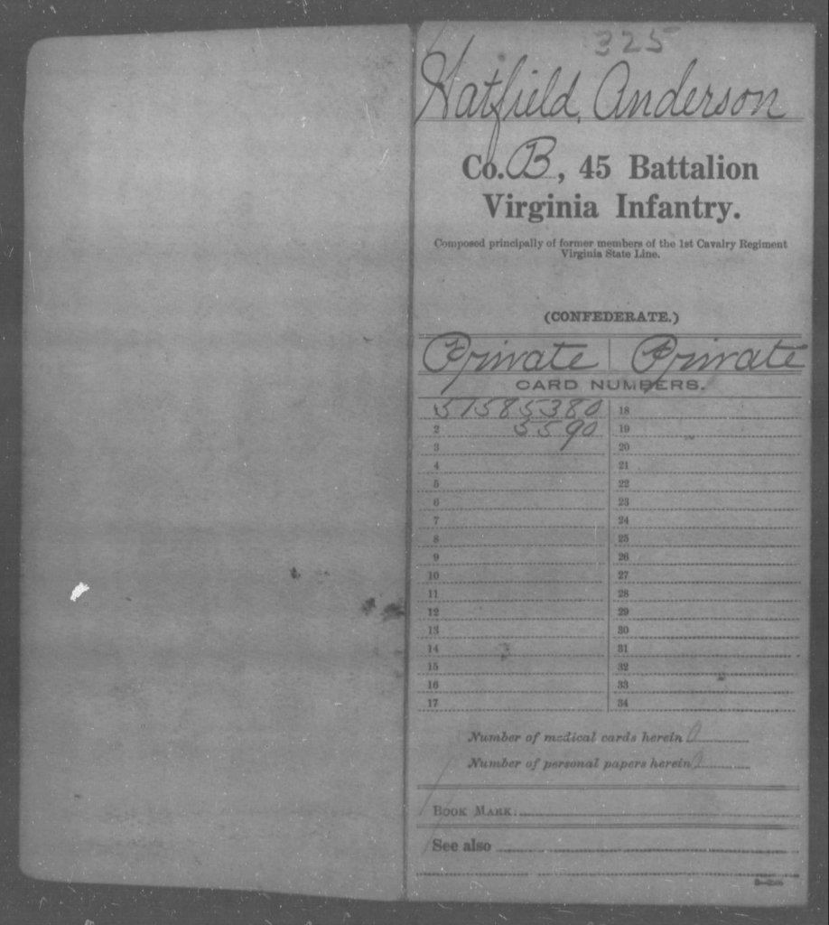 Hatfield was an imposing figure, six feet tall or taller. Military records describe him as having dark hair, dark eyes, and a dark complexion, and for most of his life he wore a full, dark beard. He was an outdoorsman and an avid bear hunter. His name is usually given as William Anderson Hatfield in the secondary sources, but he consistently used just Anderson. Various stories account for his colorful nickname, which distinguished him from cousin Anderson ‘‘Preacher Anse’’ Hatfield.