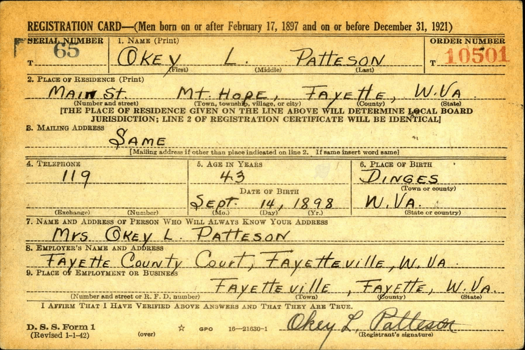 Okey Patteson was son of L.C. and Lola (Groves) Patteson. He was born at Dingess, West Virginia and raised at Mount Hope, Fayette County. He married Lee Hawse in 1923 and they had two children, Fanny Lee and Anna Hughes. His religious affiliation was Methodist. In 1932, a hunting accident left him disabled, as both of his legs had to be amputated below the knees.