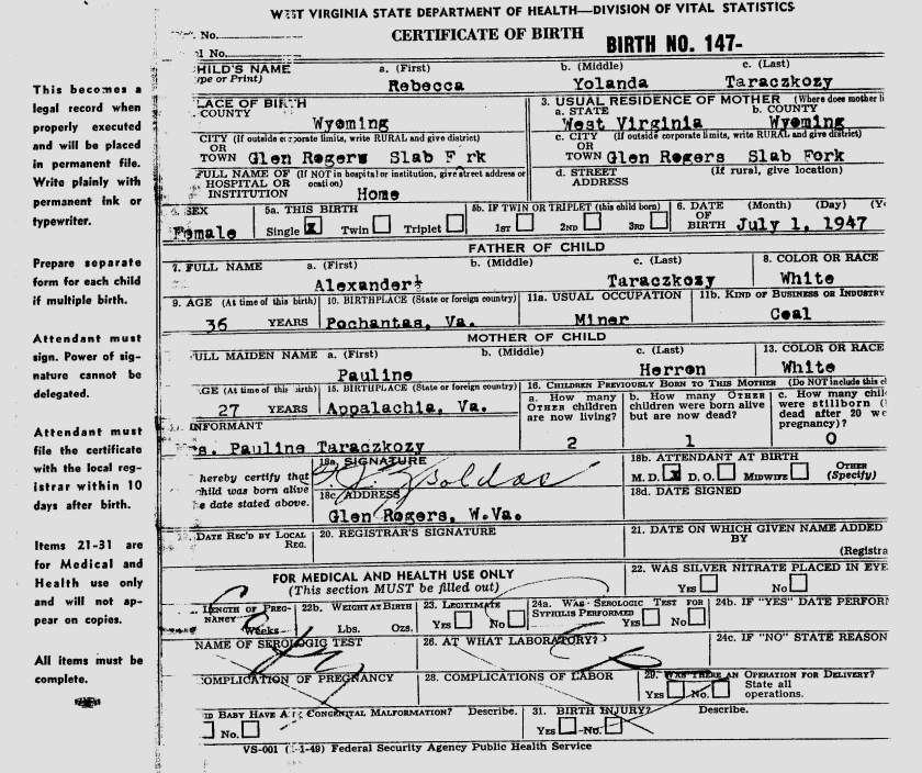 Using as an example my Mom’s (which is not old enough to search in the archives, but for visual reference), this is what a regular Wyoming County, West Virginia birth certificate from 1947 looks like:
