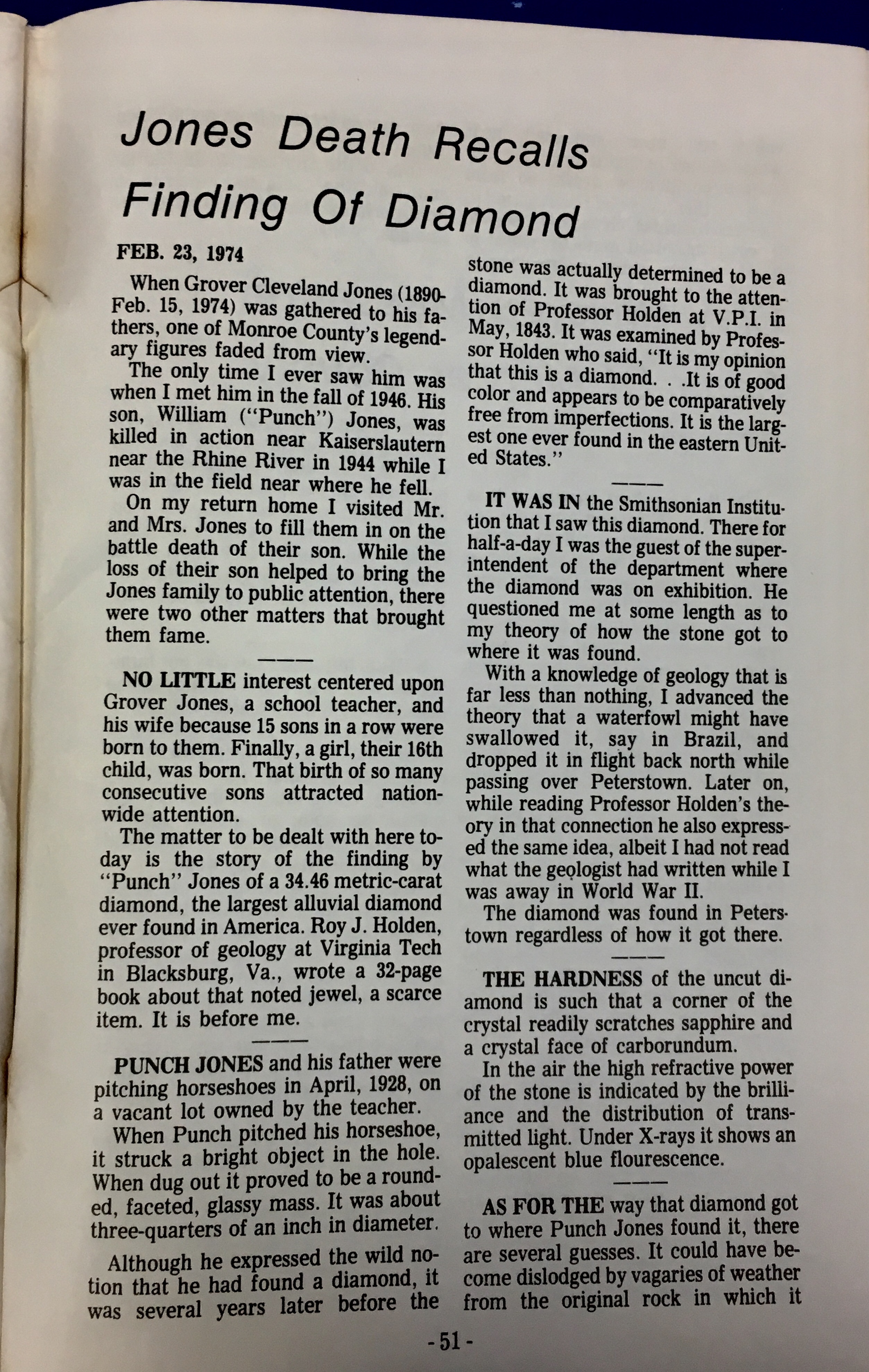 Happenstance and a game of horseshoes led to the finding of the Jones Diamond. The diamond, also called the Horseshoe Diamond, was found on Rich Creek, near Peterstown, on Annie and Grover Jones’s property.