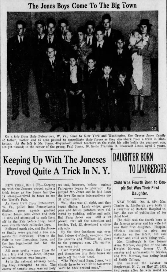 Grover Cleveland Jones and his family were celebrities in 1940. They were invited guests to the New York World’s Fair and they got to meet Mayor LaGuardia and have dinner with President Roosevelt. That’s because Grover and his wife, Annie, had produced 15 consecutive sons, and all were alive and well. The family’s endorsement was sought by a number of companies, but Grover refused and the Jones’s went home to Peterstown. That must have been a difficult decision, as Grover struggled as a county school teacher to support his vast family.