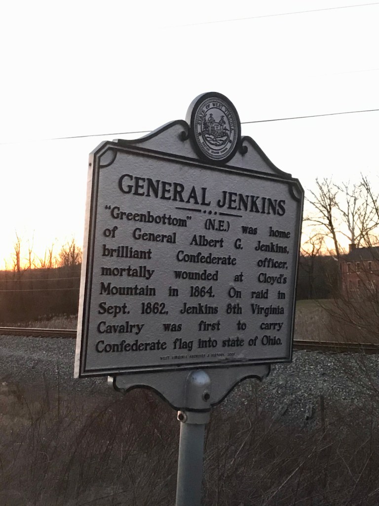 Inscription: “Greenbottom” (N.E.) was home of General Albert G. Jenkins, brilliant Confederate officer, mortally wounded at Cloyd’s Mountain in 1864. On raid in Sept. 1862, Jenkins 8th Virginia Cavalry was first to carry Confederate flag into state of Ohio.