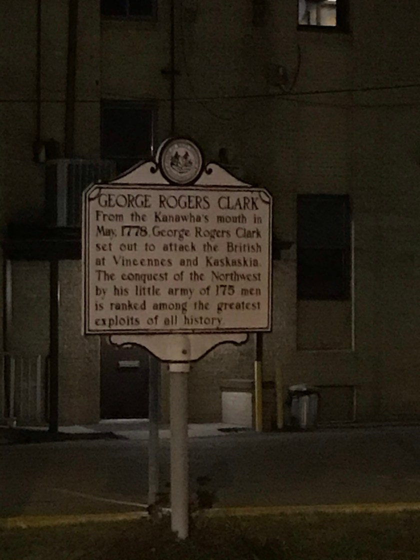 Inscription: From the Kanawha’s mouth in May, 1778, George Rogers Clark set out to attack the British at Vincennes and Kaskaskia. The conquest of the Northwest by his little army of 175 men is ranked among the greatest exploits of all history.”