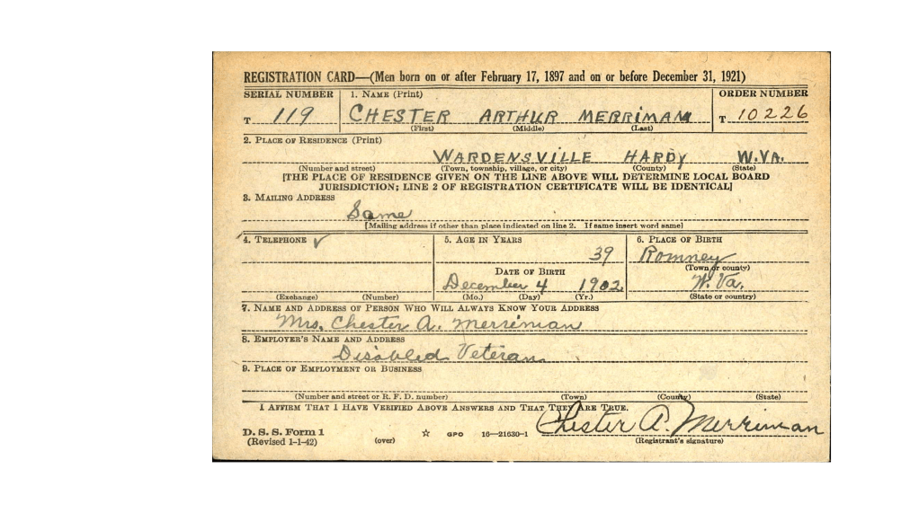 Merriman passed away Sep 25, 1975 and is buried in Wardensville, Hardy County, West Virginia, USA