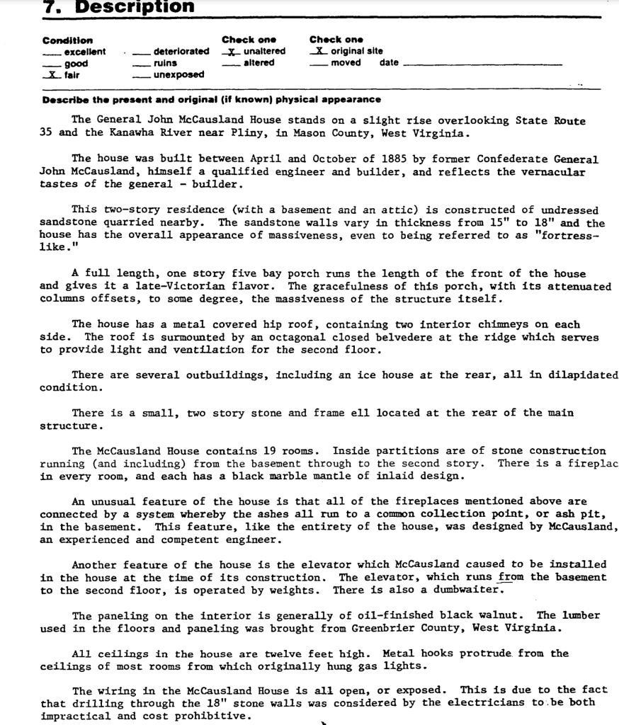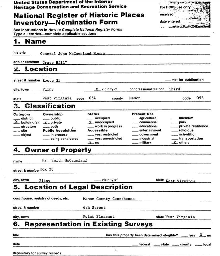 McCausland’s house, Grape Hill, was listed on the National Register of Historic Places in 1980.