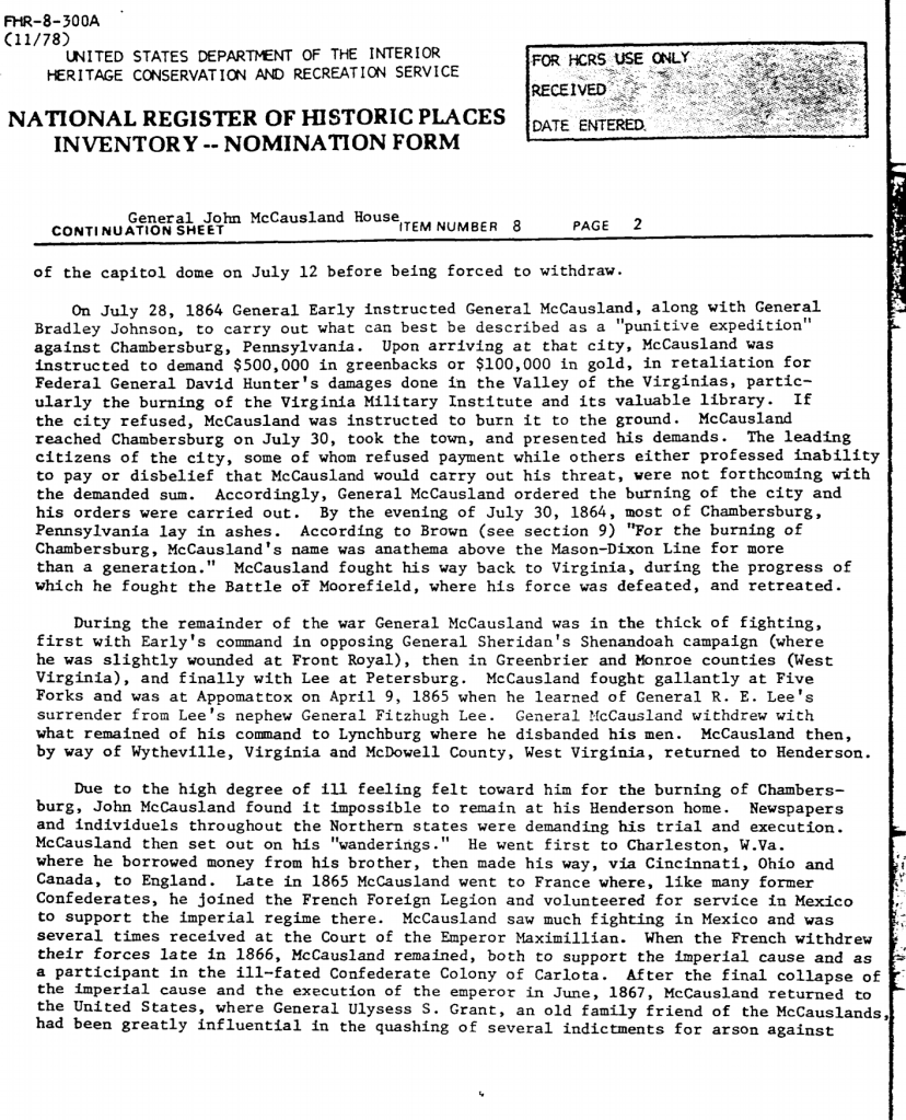 McCausland fled the country after the sound defeat of the Confederacy. He believed he would be held accountable for his actions at Chambersburg. He ended up returning in 1867 and lived out the rest of his life on his large farm in Mason County, WV. He was an unrepentant member of the “Lost Cause”. He was also the next-to-last Confederate general to die. His remains were buried at Henderson.
