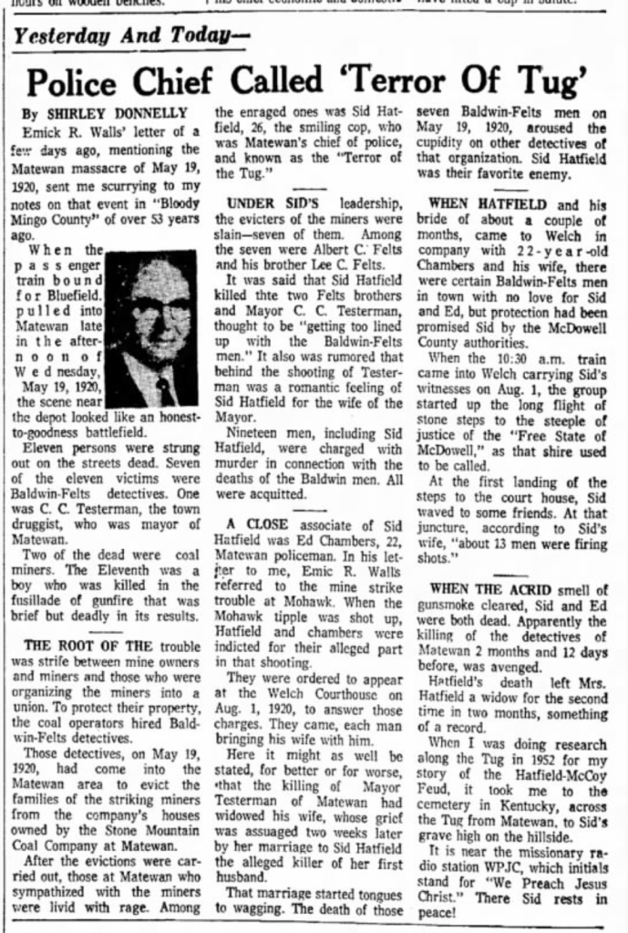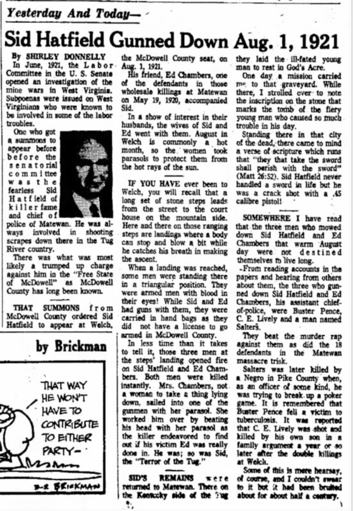 In the process of putting this blog together, I have found a peaked interest in Jessie Lee (Maynard) Hatfield, Sid Hatfield’s “on the fly” wife. I believe there should be (if there is not already) a documentary on this woman who hopped from bad-boy-husband to bad-boy-husband with several men finding themselves dead in her wake. With a little more research, I will have a blog together for her as well.