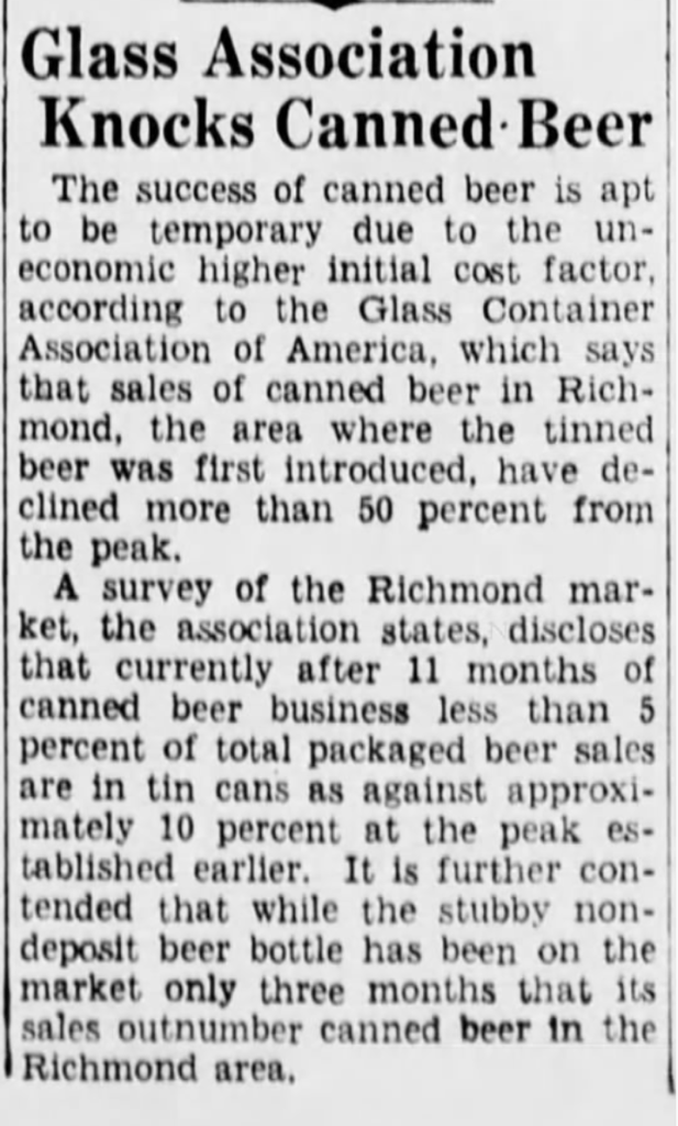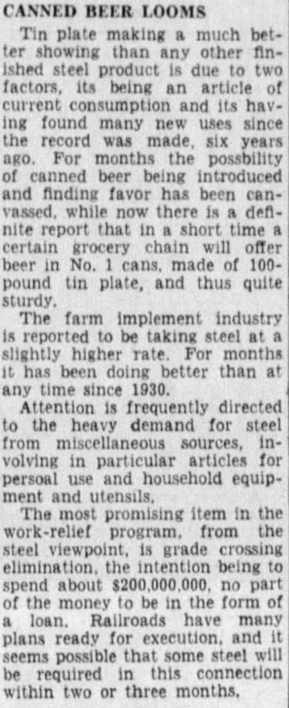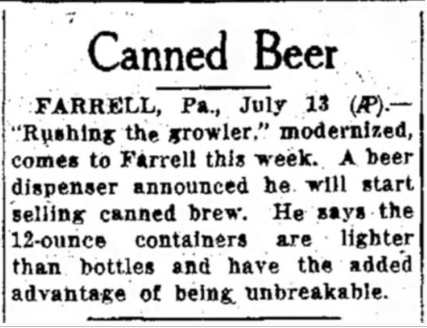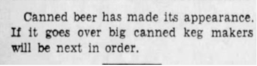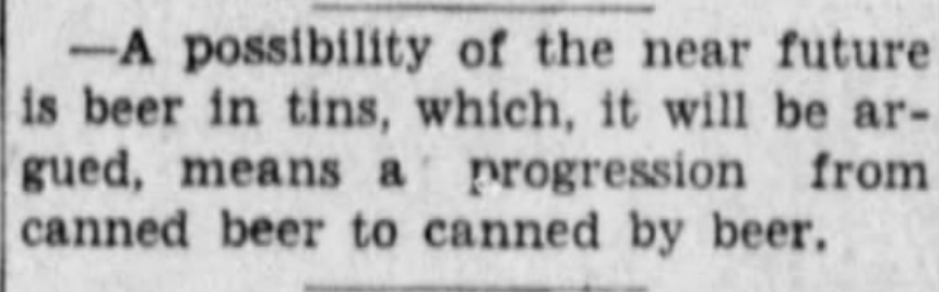 In the newspapers you can find small hints that canned beer was on the horizon and that they were working preemptively to show the industry why it would be of great use. The article below points out a valuable highlight of canned brew: the container will not break. I am sure that would have been most useful to saloons and bars of the time.