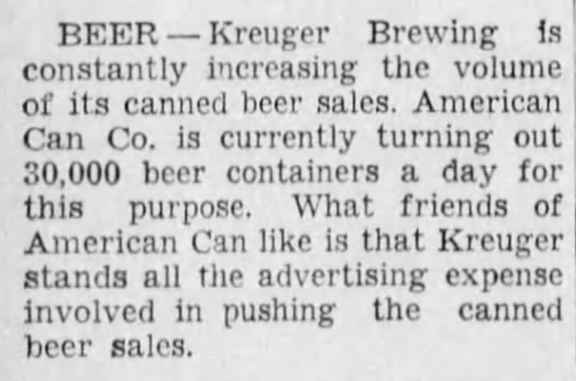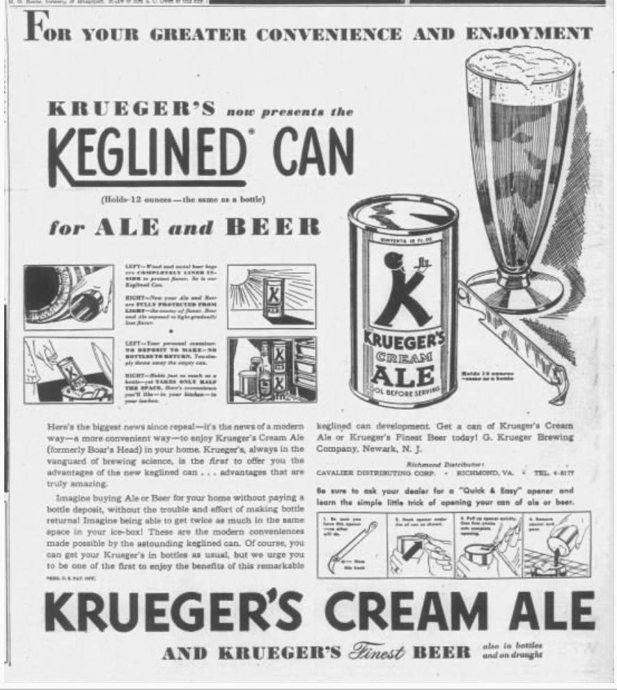 I was really glad to find one of the first advertisements for the canned Krueger’s Cream Ale. This was from a Richmond newspaper, where the beer was initially distributed with a 91% approval rating.
