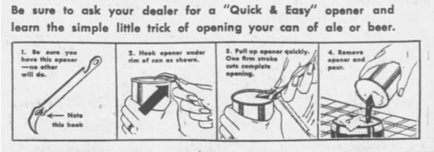 I would like to highlight from the advertisement above that these cans were nothing like what we have today. It would be some years before a pull tab was invented. This creation looked more like that of a can of motor oil when opened.