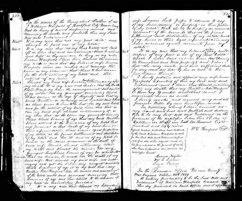 Pulled from WV Archive records, I found that William Harpold died of typhoid fever at the age of 44 on October 15, 1869, the same year his salt furnace was incorporated. In pulling old will and probate records, I was able to find his last will and testament which gave us a glimpse at his devotion to his wife Susan.