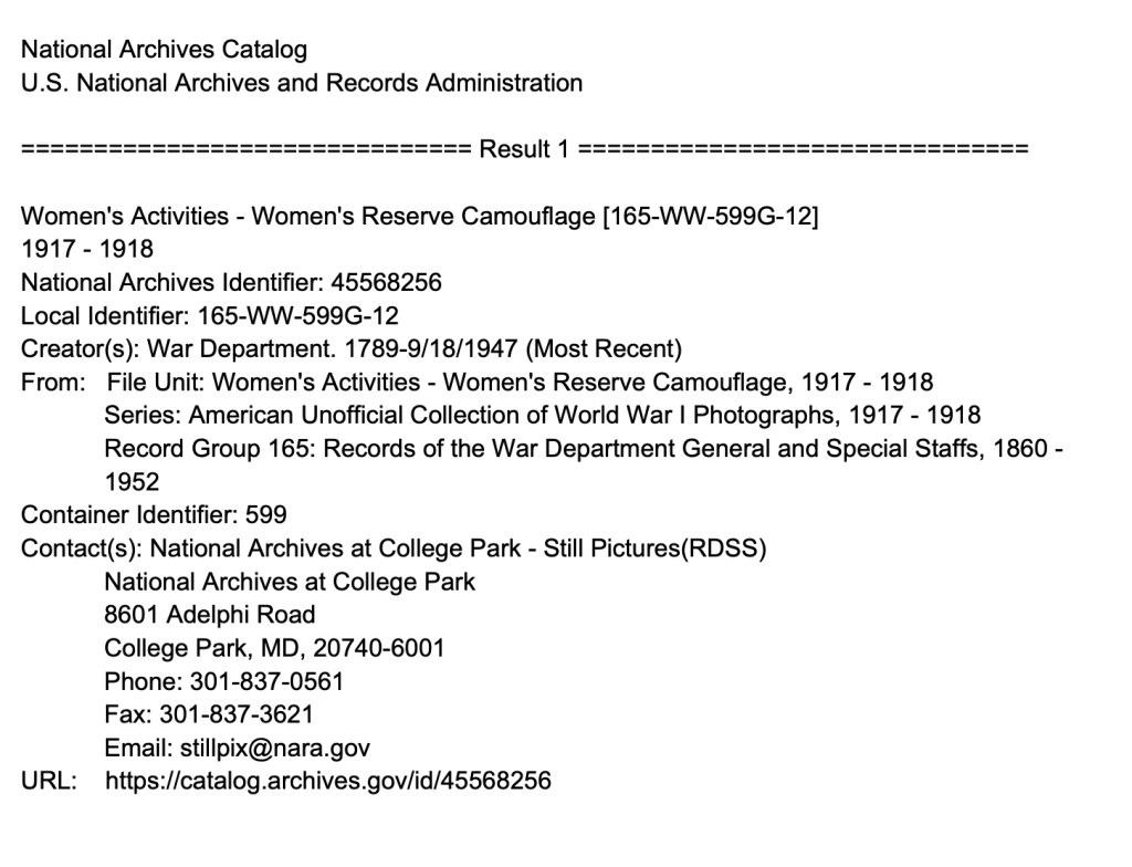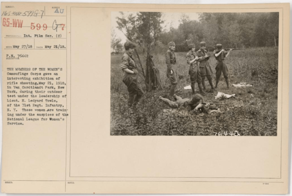The Women’s Reserve Camouflage Corps was a specialized unit of American women artists formed during World War I to design and test camouflage techniques for the military. They created both clothing and disguised military equipment for the war effort. Disbanded at the end of the war, women volunteered again to work on camouflage projects in World War II.