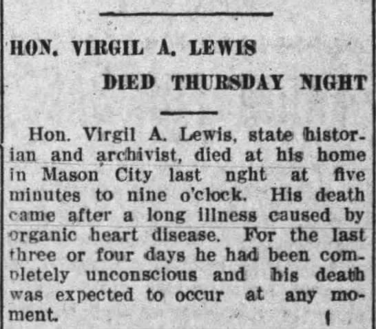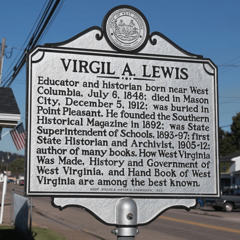 Death and Legacy: Lewis died in 1912 and was buried at Lone Oak Cemetery in Point Pleasant, West Virginia.[4] His papers are held by Marshall University[5] and by West Virginia University.[6] His former home in Mason City, now known as the Shumaker-Lewis House, was placed on the National Register of Historic Places in 1979. The West Virginia Historical Society’s Virgil A. Lewis Award is named in his honor.