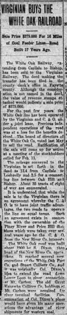 Under an agreement with the C. & O. Railway, the White Oak Railway operated passenger and freight trains along the tracks of the C. & O.’s White Oak Branch between Glen Jean and Carlisle. In 1912, the New River Company sold the locomotives and rolling stock of the White Oak Railway and jointly leased operation of the railroad to Virginian and the C. & O.
