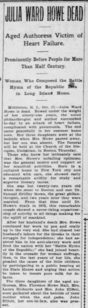 During the Civil War, Julia Ward Howe (May 27, 1819 – October 17, 1910) worked for the US Sanitary Commission, which promoted clean and hygienic conditions for soldiers and hospitals. She was an advocate for abolitionism and a social activist, particularly for women’s suffrage.