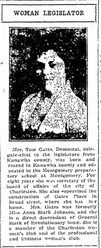 This blogger finds it annoying to not be able to find newspaper articles on a member of the WV Legislature and, more importantly, one of our state’s first women in politics. It became MORE annoying to find out that a huge swath of articles name her ras Mrs. Tom Gates and NOT Delegate Anna Gates. She fought for women’s rights and they still named her more a man’s wife than a voted-in politician. Annoying.