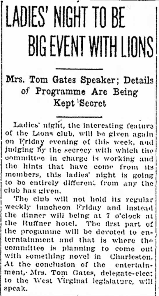 The first woman to represent the state of West Virginia in the legislature has made known the things she will endeavor to accomplish when that body meets. In a speech delivered at a meeting of the Charleston Lions club last Friday, Mrs. Tom Gates, elected a member of the house of delegates at the election of November 7, delivered her first speech since the campaign.